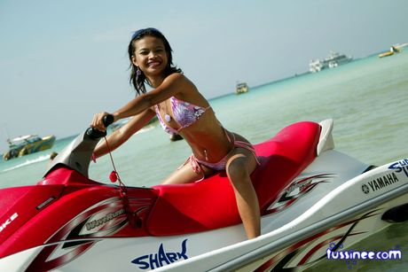 Tussinee: Asian teen model at the beach poses on a Jet Ski
